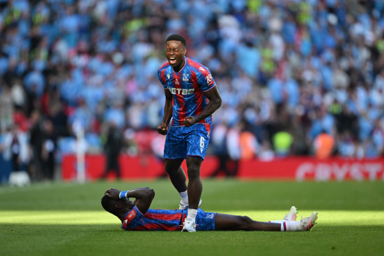 LONDON, ENGLAND – MAY 17: Marc Guehi and Ismaila Sarr of Crystal Palace celebrate victory following the Emirates FA Cup Final match between Crystal Palace and Manchester City at Wembley Stadium on May 17, 2025 in London, England. (Photo by Shaun Botterill/Getty Images)