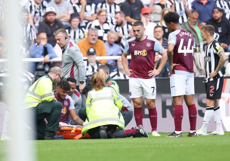 NEWCASTLE UPON TYNE, ENGLAND – AUGUST 12: Tyrone Mings of Aston Villa looks dejected after sustaining an injury during the Premier League match between Newcastle United and Aston Villa at St. James Park on August 12, 2023 in Newcastle upon Tyne, England. (Photo by George Wood/Getty Images)