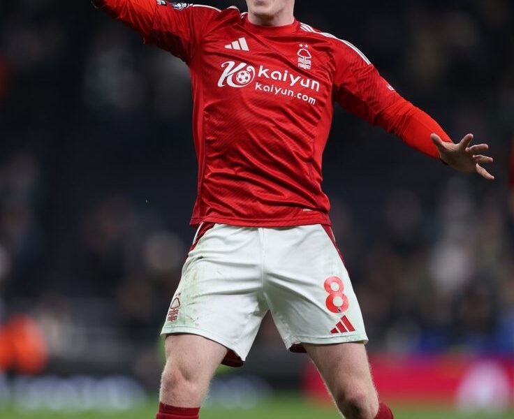 LONDON, ENGLAND – APRIL 21: Elliot Anderson of Nottingham Forest celebrates victory during the Premier League match between Tottenham Hotspur FC and Nottingham Forest FC at Tottenham Hotspur Stadium on April 21, 2025 in London, England. (Photo by Mark Leech/Offside/Offside via Getty Images)